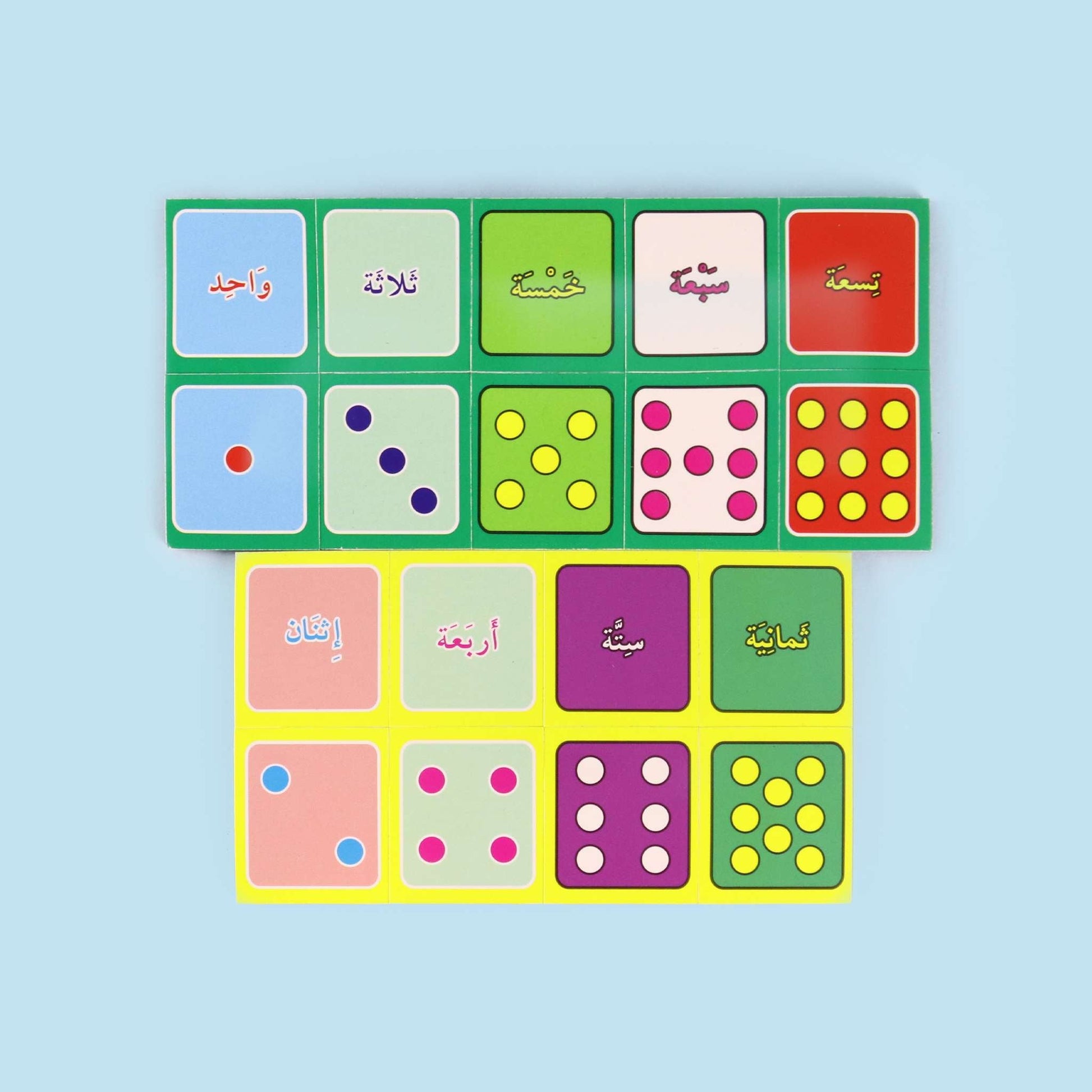 قطعاً ممغنطة تحمل الأعداد من 1 إلى 9 بالرموز والنقاط وكتابة مع التمييز بين الأعداد المفردة والمزدوجة.