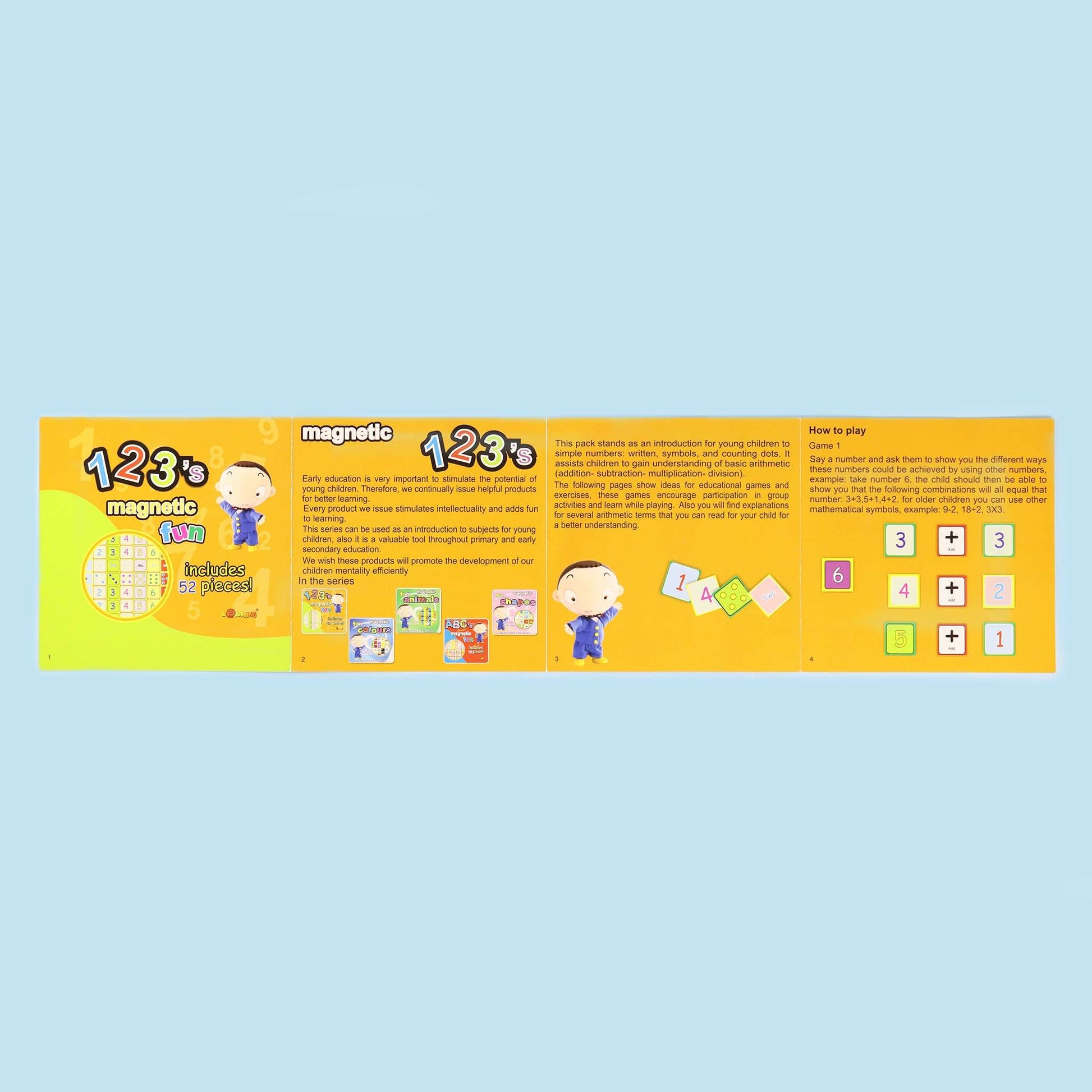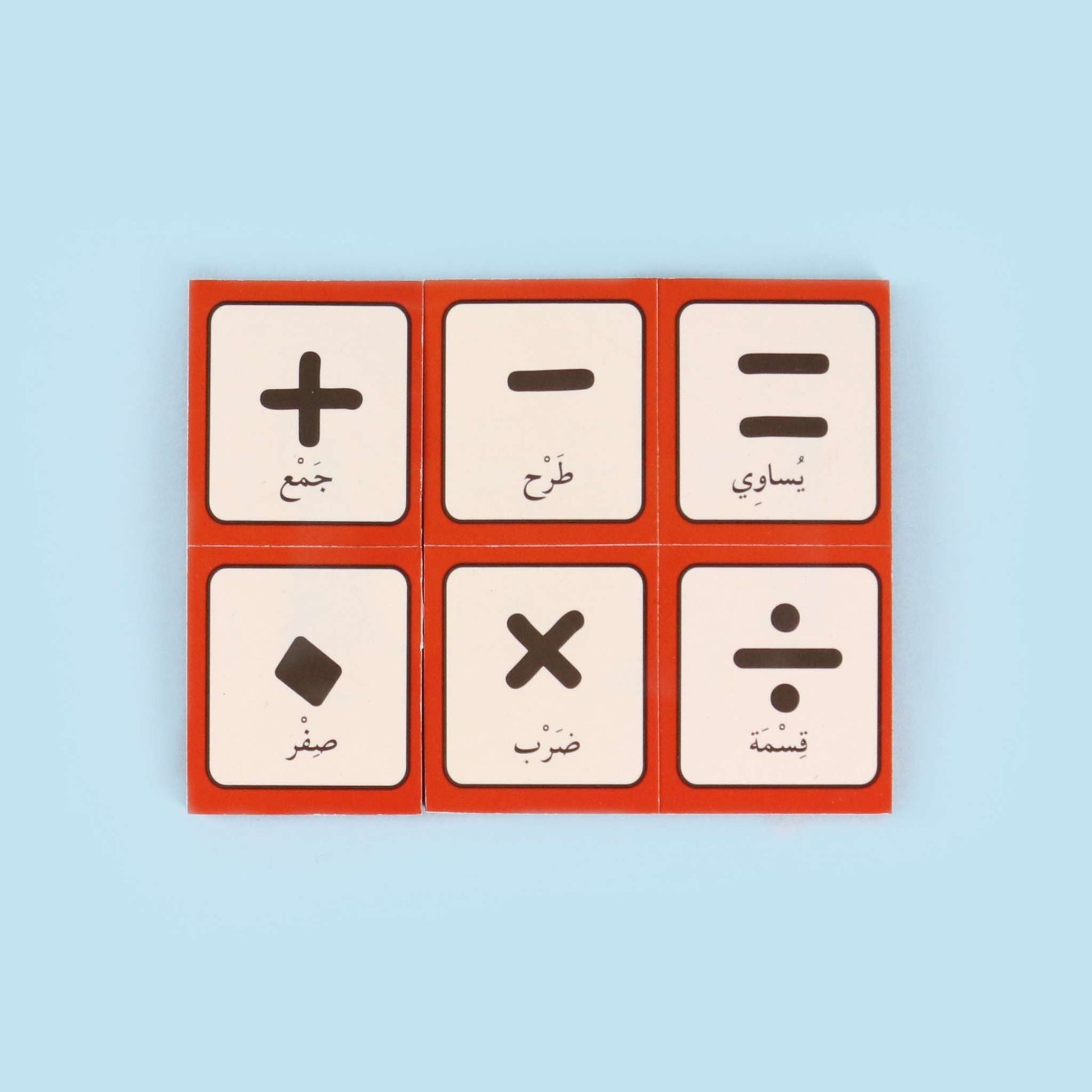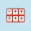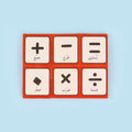 علبة المغناطيس خاصّة بالتعليم المبكّر، تتضمن قطعاً ممغنطة للأعداد (الأرقام) بالإضافة إلى رموز الجمع، الطرح، الضرب والقسمة.