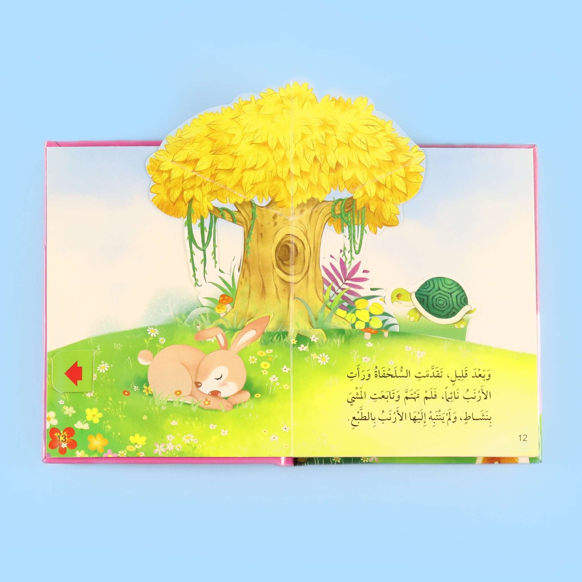 في قصة الأرنب والسلحفاة، يتعلّم الطفل أن الغرور قد يقوده إلى الخسارة، وأن المثابرة والتصميم هما سرّ النجاح.
